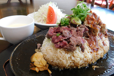 看板メニューはステーキ丼!その他ハンバーグ・オムライス等がありメニューがとっても豊富。丼ランチにはAとBがあり今回はステーキもハンバーグもどっちも食べた~いという方には超おすすめ!『丼ランチB』をいただきました。オーダーしてから提供までの時間がとっても早く仕事の合間に来られる方にもオススメです。ジュゥジュゥとソースが熱した鉄板を跳ねる音に、さらに醤油ベースのソースの香ばしい匂いが食欲を刺激する、ご飯の上にはたっぷりのステーキと手作りハンバーグが、いまにもこぼれ落ちそうなくらいで登場! ランチでも気軽にあつあつの料理を食べていただきたいと考えられたそうです。別々で味わうのもよし、両方混ぜ合わせてるとさらに“こじゃうま!”スプーンでガッツリぺろり食べちゃいます♪。肉の絶妙な焼き加減が最高、横にスライスされたガーリックでさらに深みを増したソースと一体となって思わず笑顔がこぼれます。セットには特製スープとミニサラダついてきます。ぜひ一度お試しあれ♪