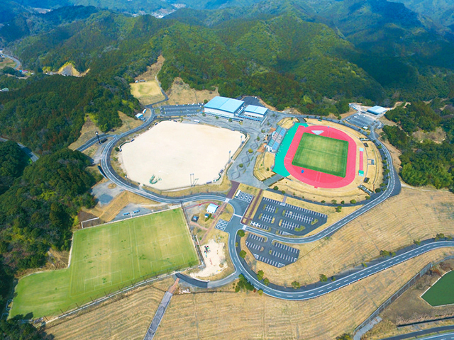 宿毛市平田町にある、防災広場をそなえた大型運動公園です。各種スポーツのほか、サイクリングやマラソンなど多くの大会が行われています。陸上競技場は全面に天然芝が整備されており、スポーツ合宿などにも最適です。